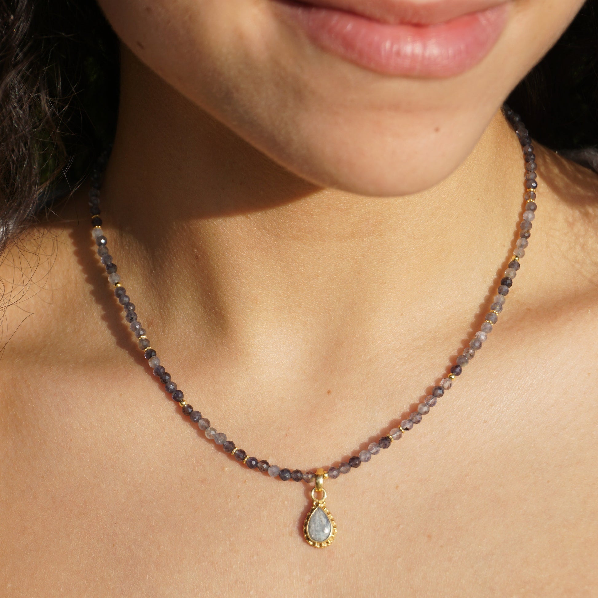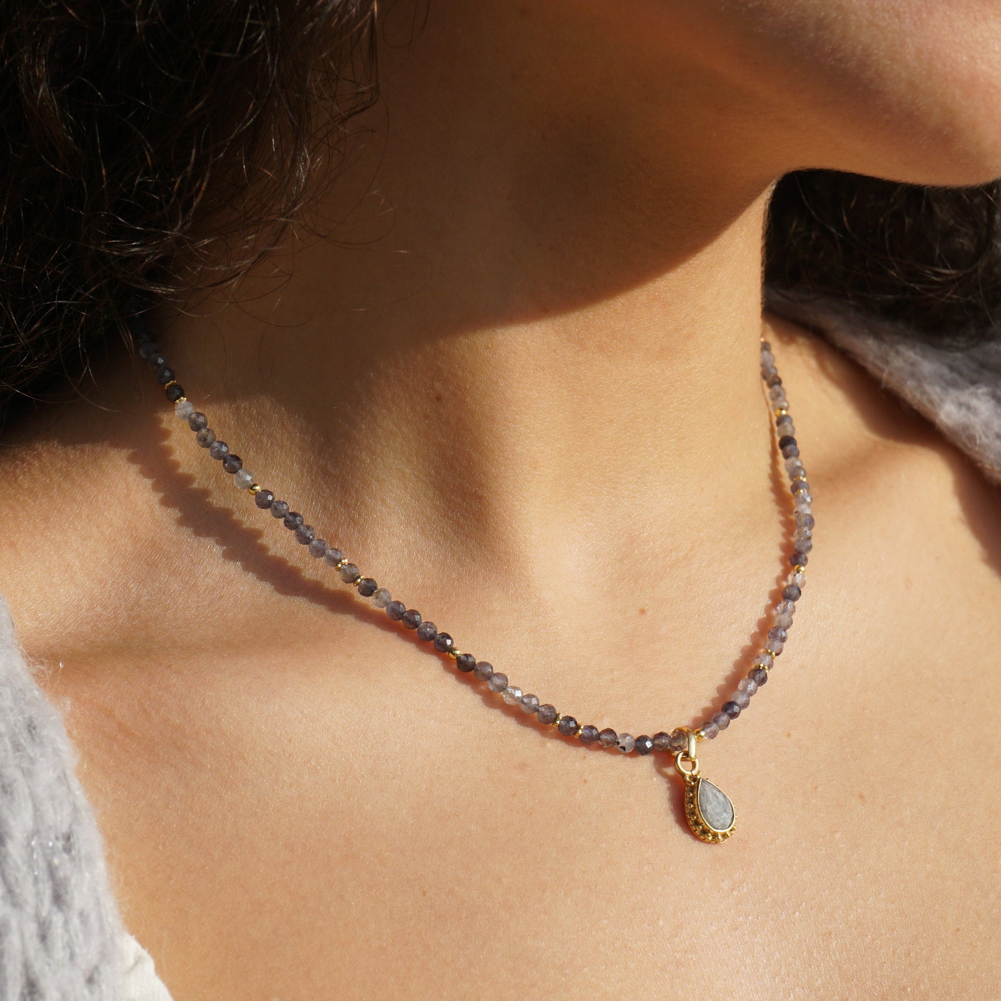 Handgefertigte Edelsteinkette Iolith 3mm facettiert mit 18k vergoldeten Sterlingsilberperlen und in 925 Sterlingsilber eingefassten Iolith Anhänger, Verschluss Karabiner 925 Sterlingsilber 18k vergoldet.