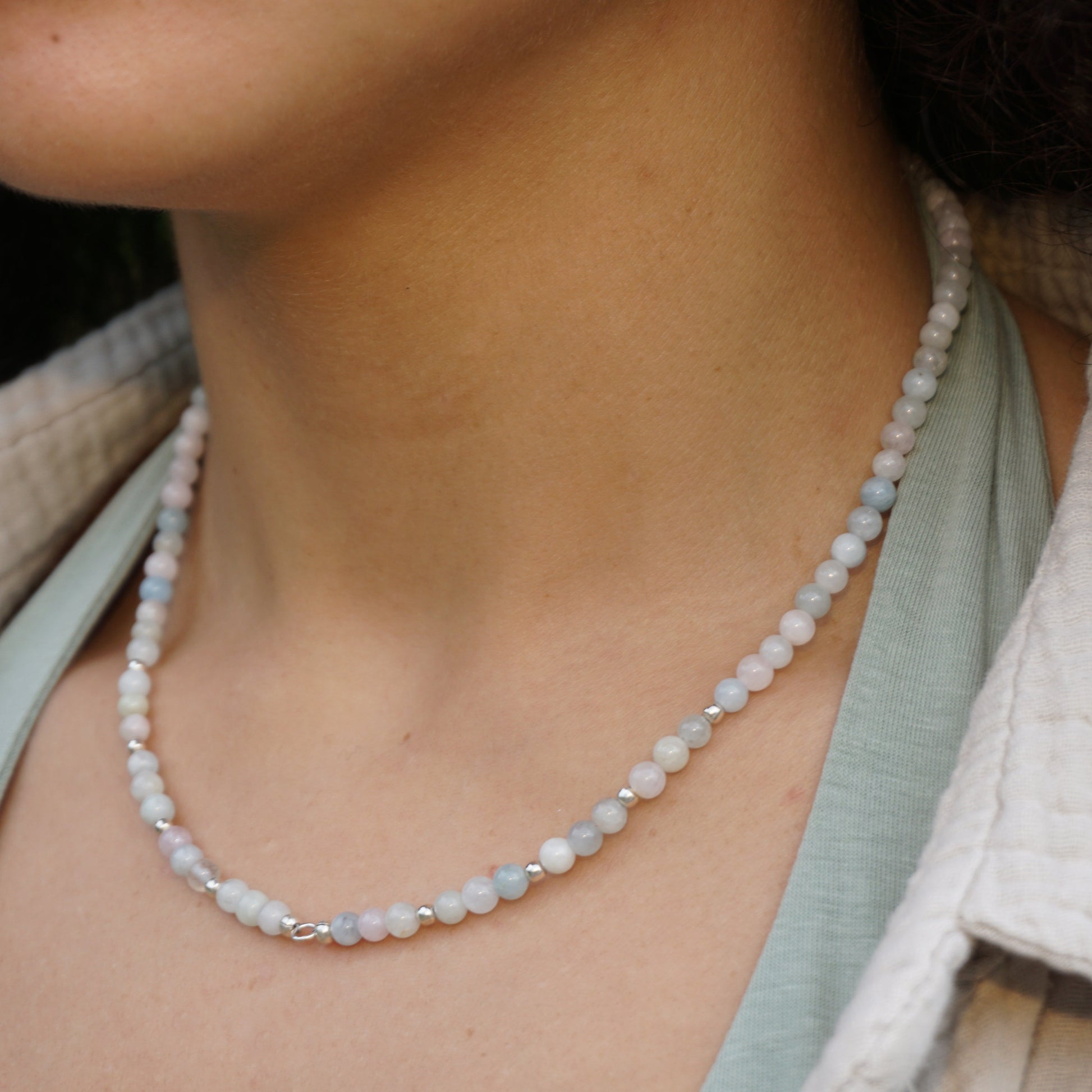 Handgefertigte Edelsteinkette Morganit 4mm rund mit 925 Sterlingsilber Perlen, Verschluss 925 Sterlingsilber.