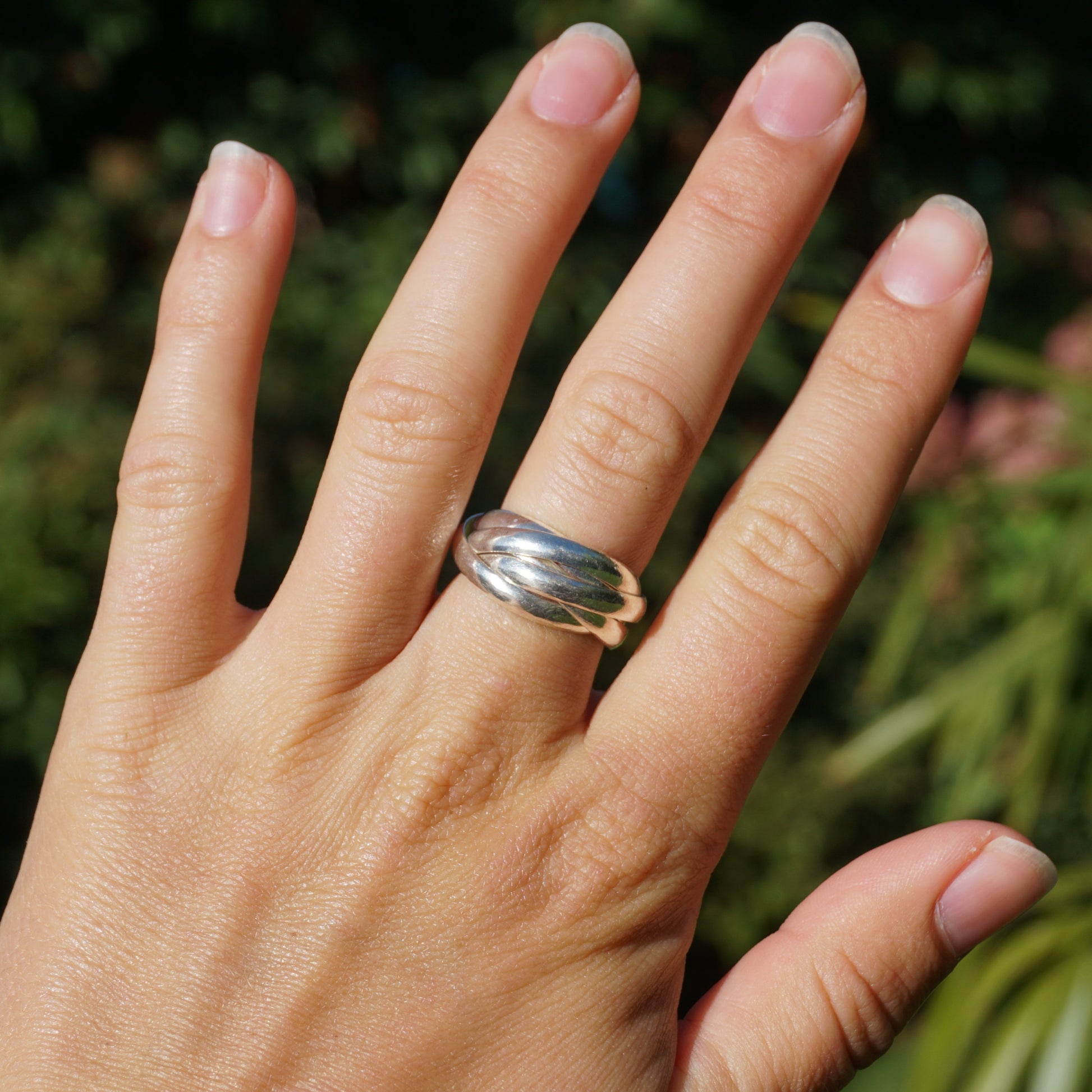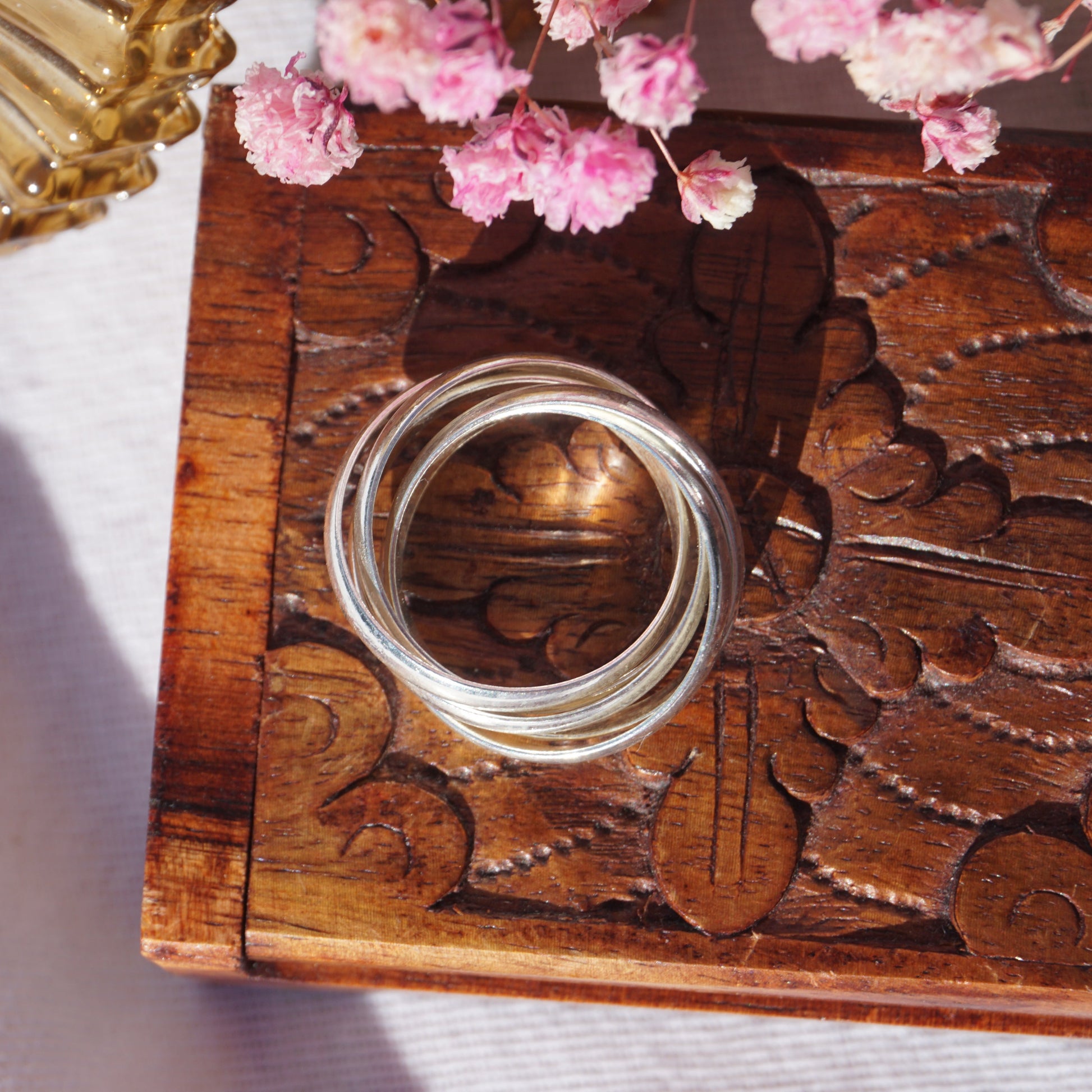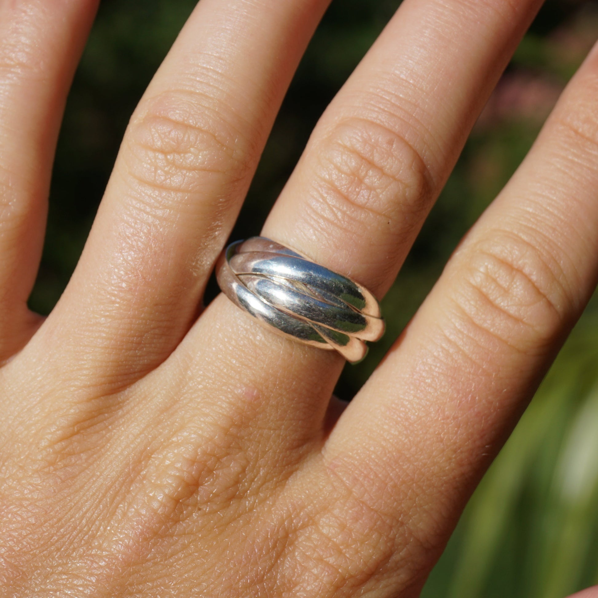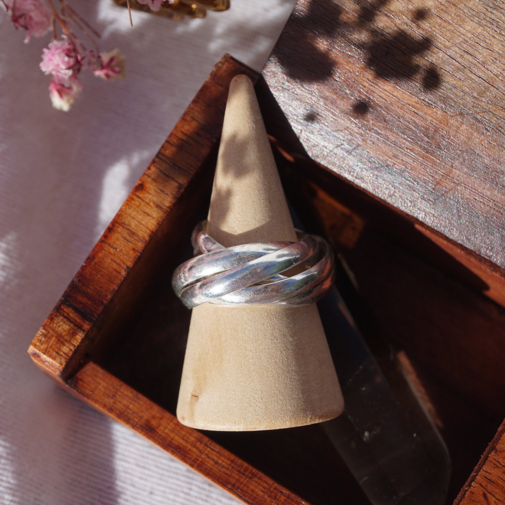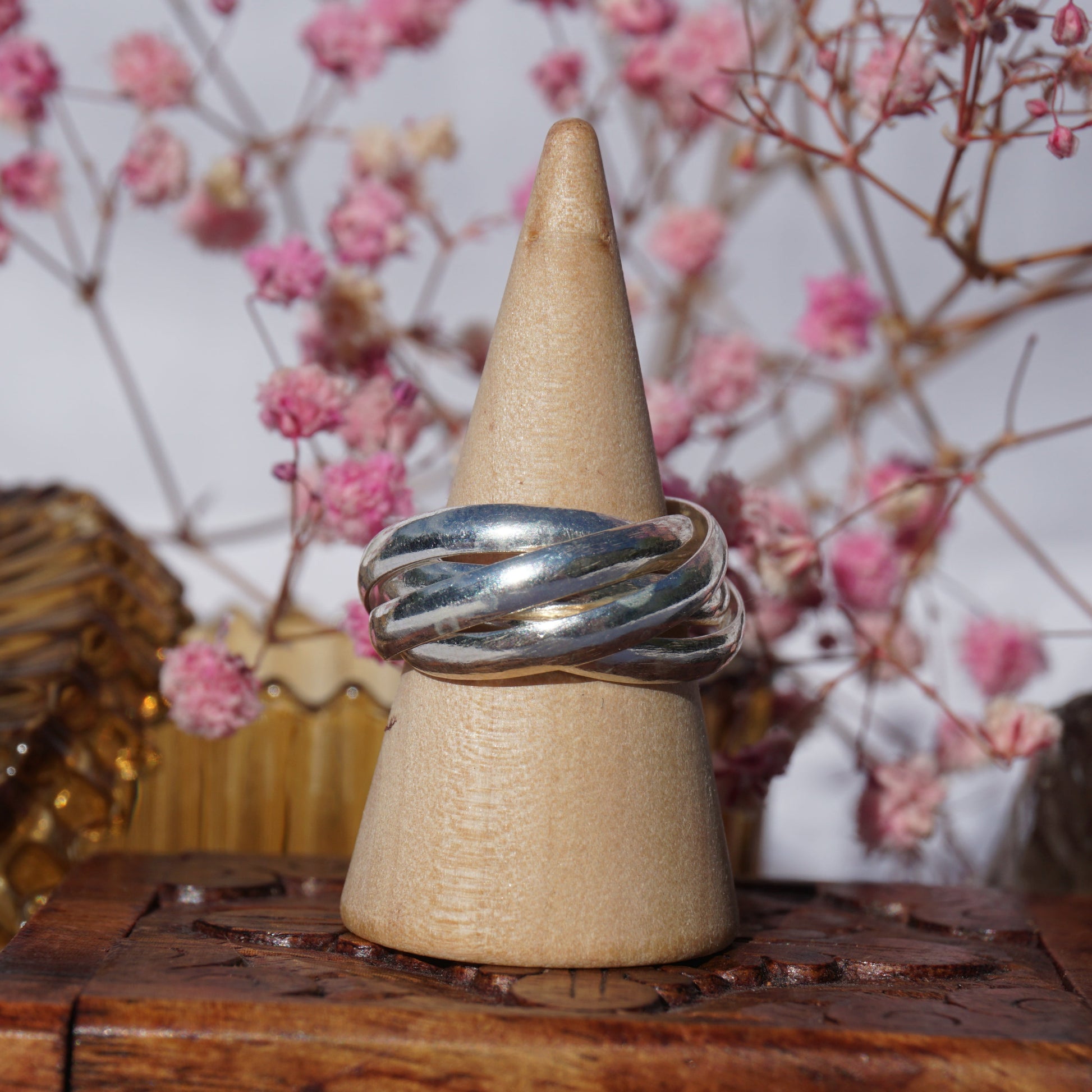 Der Ring Chaos besteht aus fünf dicken ineinander verschlungenen Ringen. Diese schmiegen sich angenehm an deinen Finger und eignen sich auch gut zum anfassen und spielen. Ein zeitloses Schmuckstück mit klarer Linienführung.