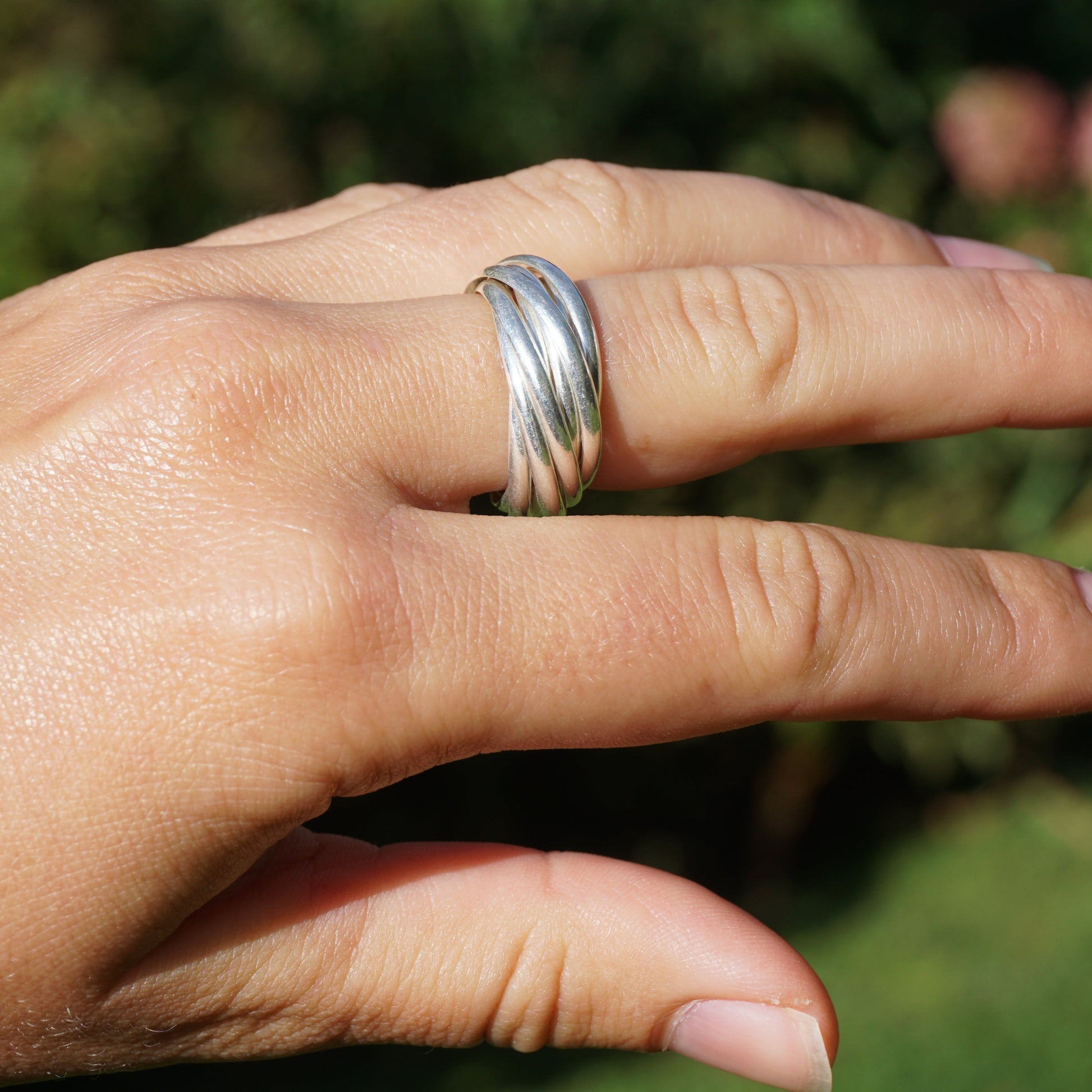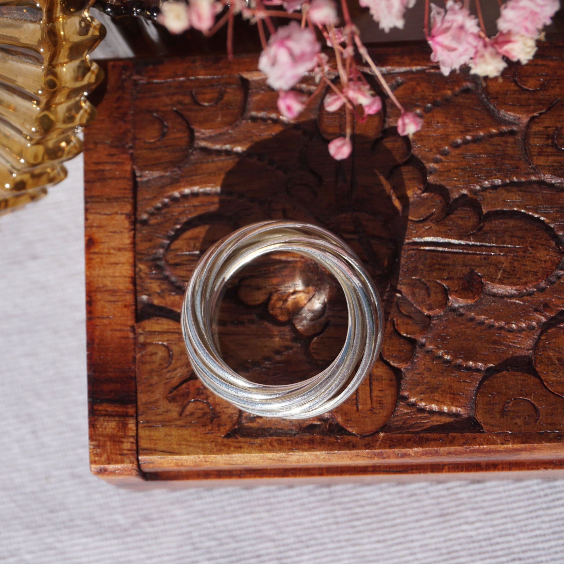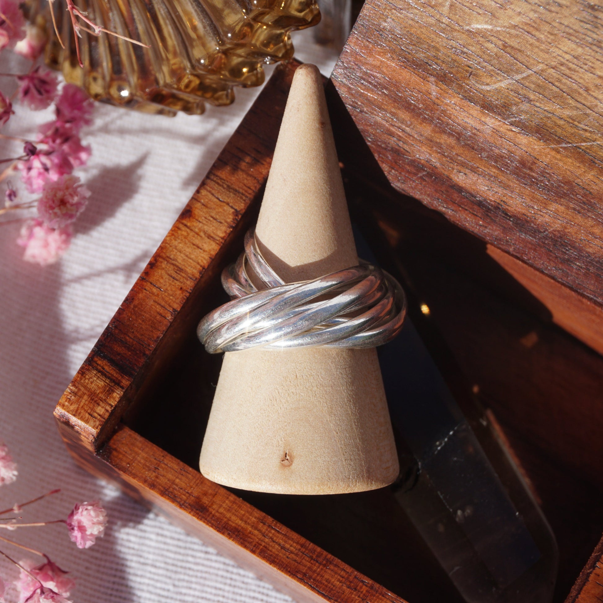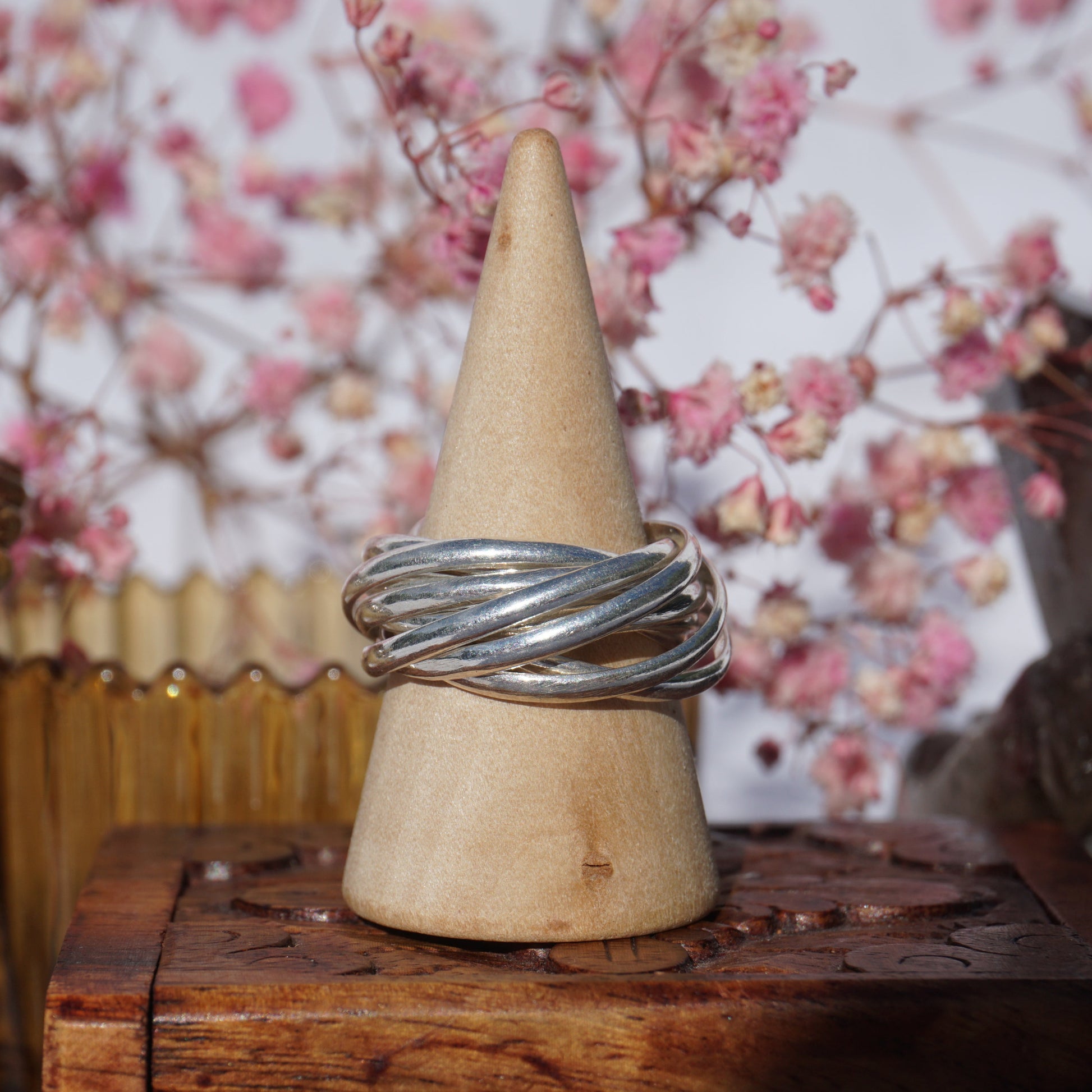 Der Ring Chaos besteht aus neun ineinander verschlungenen Ringen. Diese schmiegen sich angenehm an deinen Finger und eignen sich auch gut zum anfassen und spielen. Ein zeitloses Schmuckstück mit klarer Linienführung und der Symbolik der Balance.