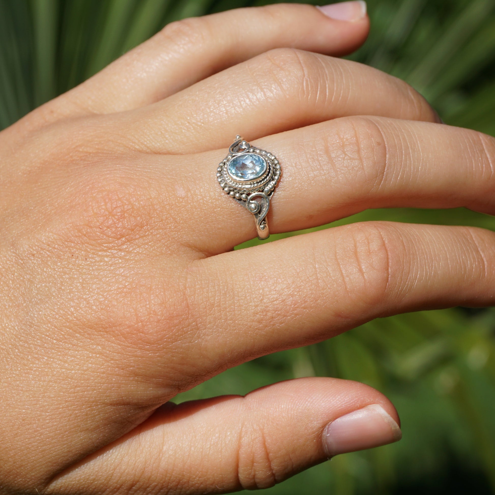 Dieses verspielte Design lässt den geschliffenen Citrin / Topas vollkommen in den Vordergrund treten. Der Citrin schimmert warm in Honigfarben. Topas ist hellblau und wirkt rein.