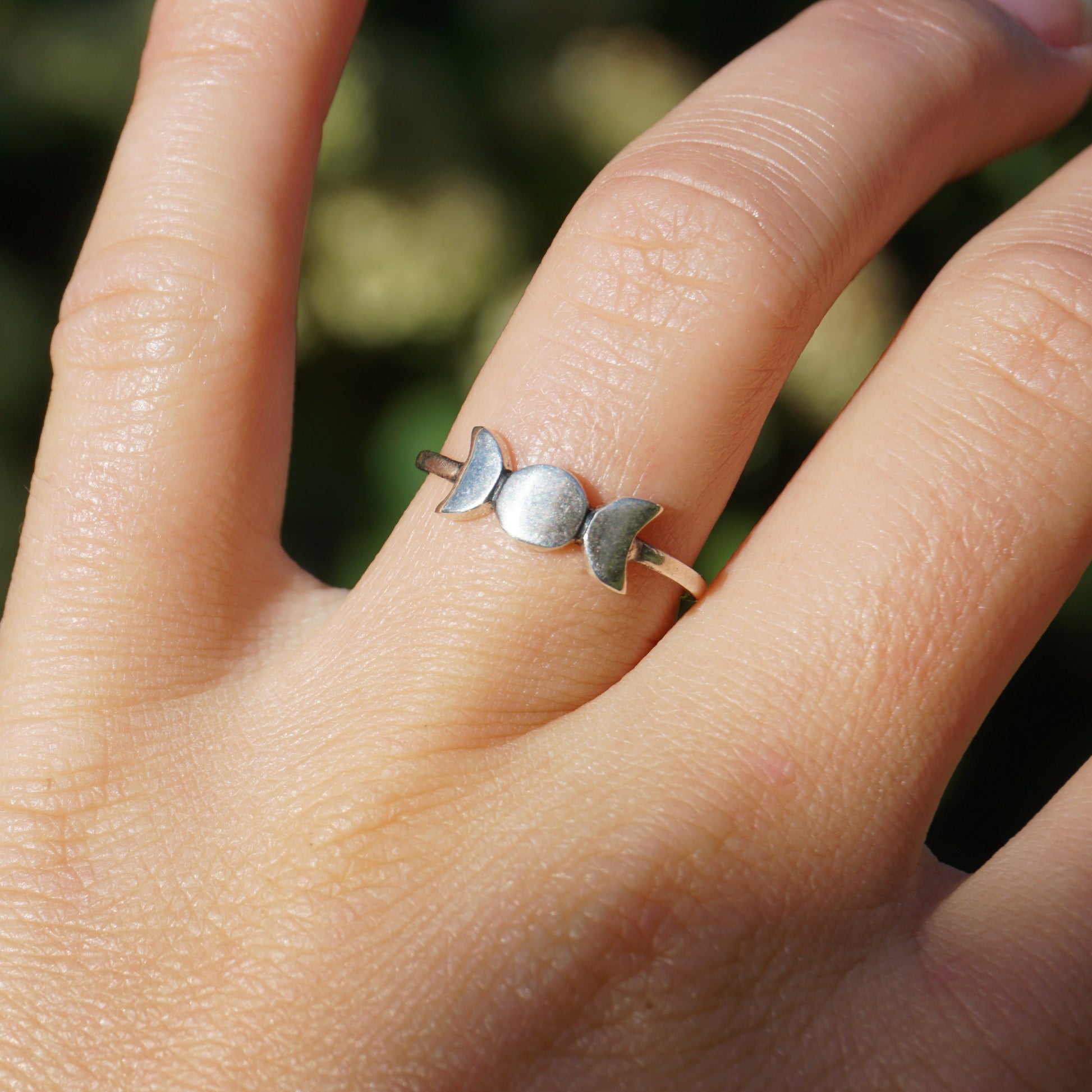 Der Ring Mondphasen besteht aus drei miteinander verbundenen Monden in unterschiedlichen Phasen. Die Phasen des Mondes stehen für den natürlichen Kreislauf von Wachstum und Loslassen. Ein zeitloses Schmuckstück und der Symbolik des Kreislaufs des Lebens.