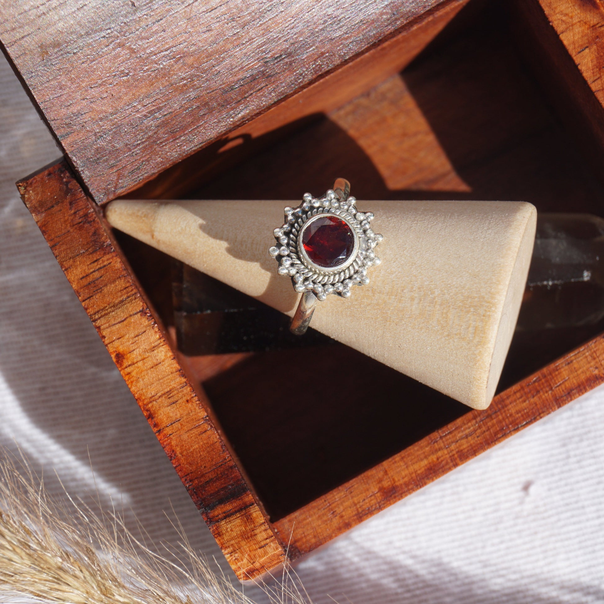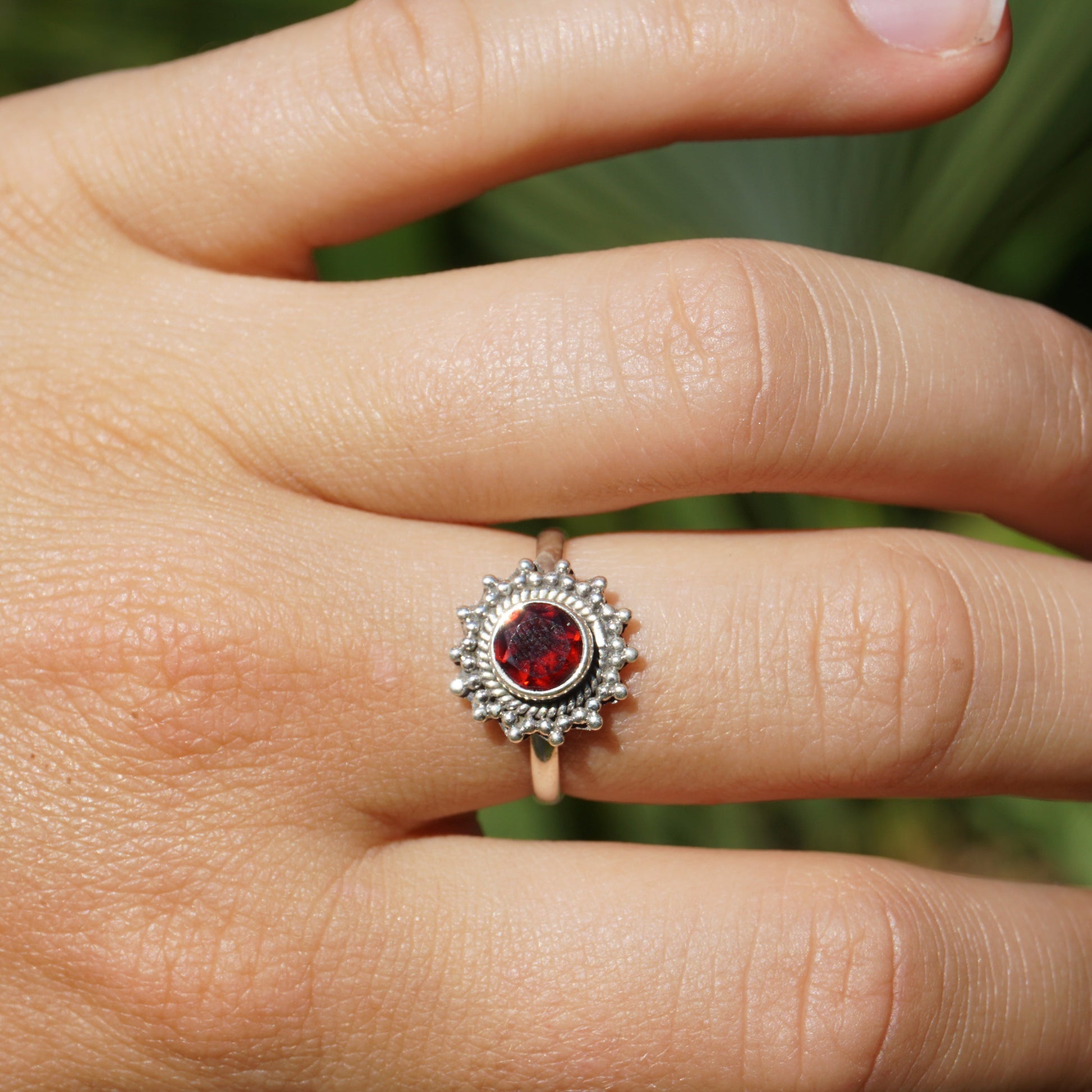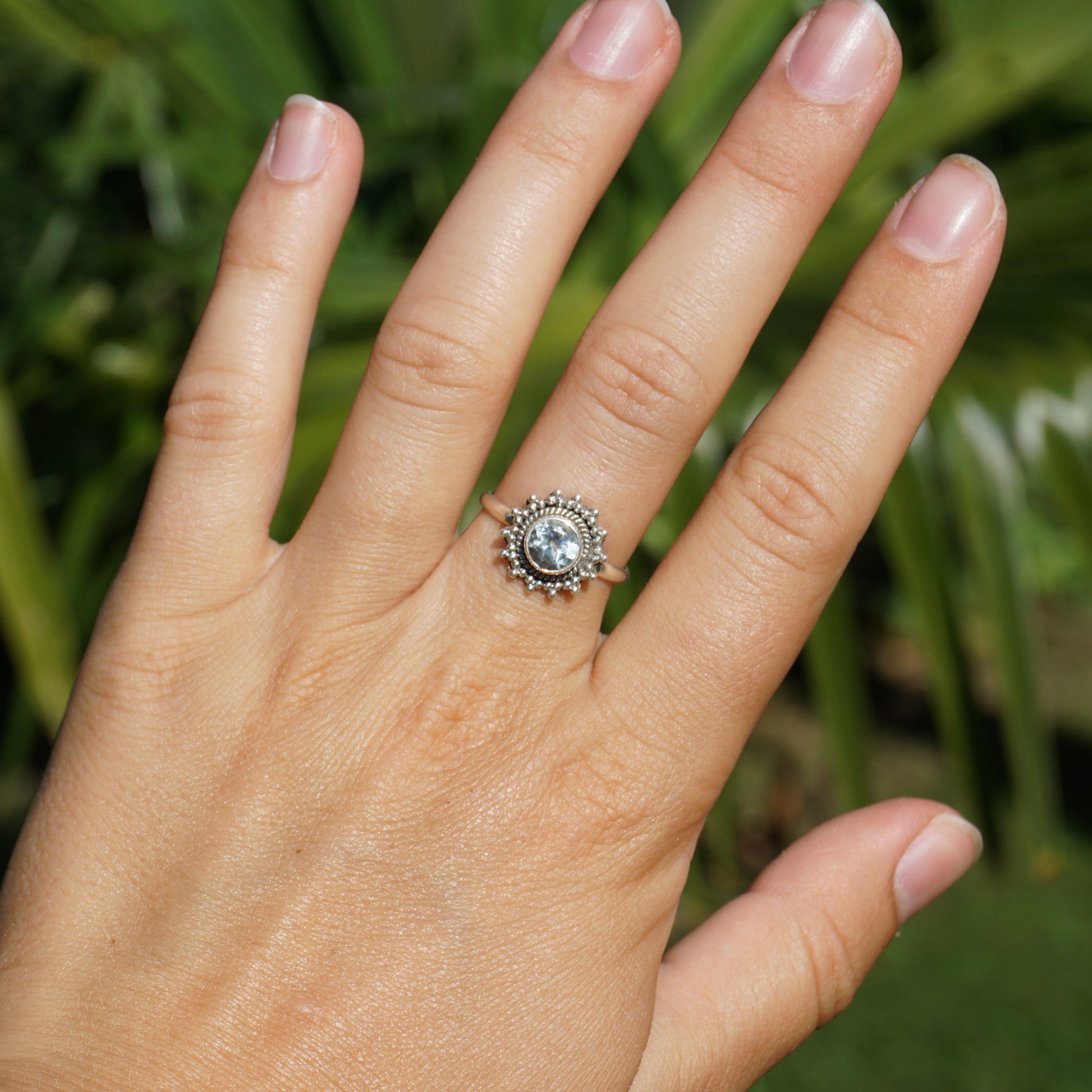 Dieses verspielte Design erinnert an die Sonne und lässt den geschliffenen Granat / Topas vollkommen in den Vordergrund treten. Der Granat schimmert dunkel rot. Der Edelstein hat eine ganz besondere Tiefe und wirkt geheimnisvoll. Der Topas ist hellblau und wirkt frisch und rein.